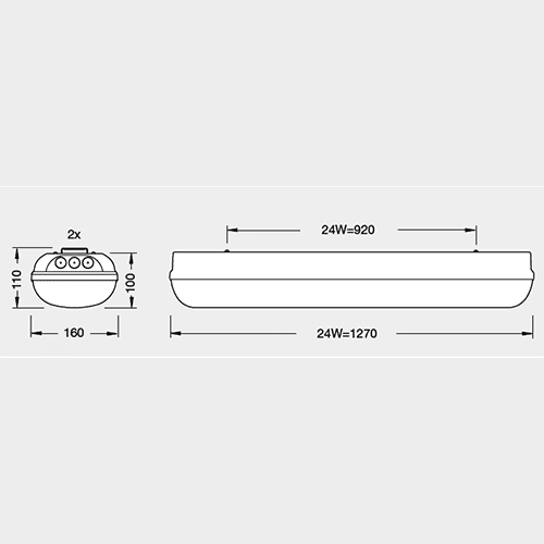Corpo in policarbonato autoestinguente V2, stampato ad iniezione, colore grigio RAL 7035. Guarnizione di tenuta iniettata ecologica antinvecchiamento. Schermo in policarbonato fotoinciso internamente, autoestinguente V2, stabilizzato agli UV, stampato adiniezione, con superficie esterna liscia, apertura antivandalica. Riflettore portacablaggio in acciaio zincato a caldo, verniciato a base poliestere bianco, fissato al corpo mediante dispositivi rapidi in acciaio, apertura a cerniera. Scrocchi a scomparsa filo corpo, in acciaio inox, per fissaggio schermo. Dimensioni: 160x1270 mm, altezza 100 mm. Grado di protezione IP65. Apparecchio a temperatura superficiale limitata. - D - Resistenza meccanica 6,5 joule. Resistenza al filo incandescente 850°C. Certificato TUV Rheinland-LGA per ambienti alimentari. Cablaggio elettronico, 230V-50/60Hz, fattore di potenza >0,90, corrente costante in uscita, classe I. Potenza dell'apparecchio 56 W. ENEC - IMQ. Assil Quality. Temperatura ambiente da -20°C fino a +35°C. 2 moduli LED lineari da 24W/865, temperatura di colore 6500 K. Resa cromatica Ra >80. Staffe di fissaggio in acciaio inox. LED 2x24W, 6424lm, 6500K.