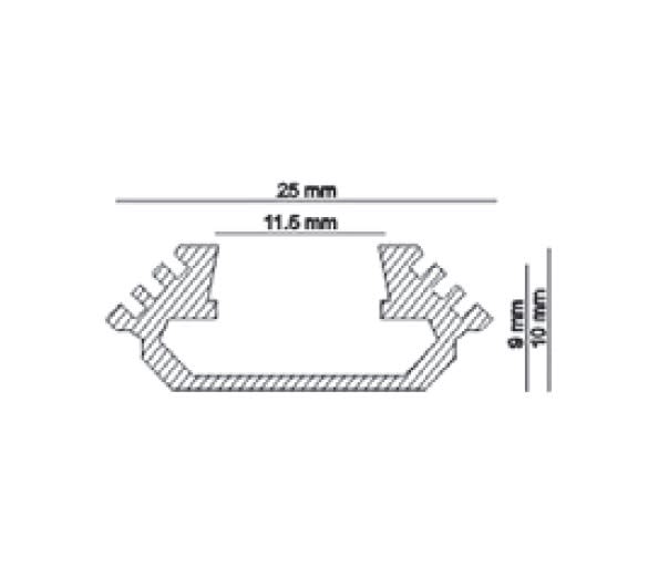 Profilo in alluminio anodizzato, per montaggio ad angolo. Con diffusore in policarbonato satinato. Lunghezza: 2 m. Dimensioni: 25 x 10 mm.