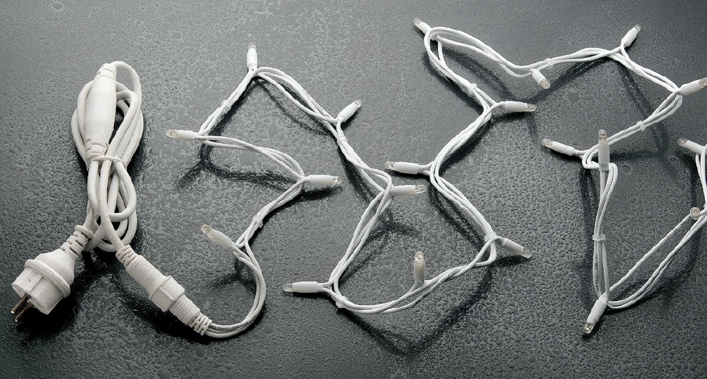 Stringa luminosa, con 40 LED ad alta luminosità e protetti contro gli urti accidentali, costruita secondo le norme EN 60598-2-20:2010. Cavo in gomma H03RN-F - 0,50 mm2, doppio isolamento, autoestinguente, prolungabile tramite connettori. La stringa vienefornita senza cavo d’alimentazione. Cavo di alimentazione in gomma H05RN-F 2x1,0 mm2 corredato di raddrizzatore da 1,6 A, spina Schuko IP 44 e connettore per il collegamento. Colore LED: multicolor.