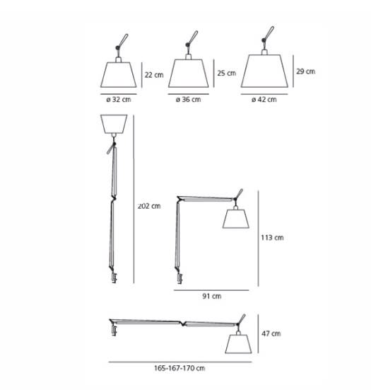 Materiali: struttura a bracci mobili in alluminio lucidato; diffusore in carta pergamena, in raso di seta o in tessuto nero supportato damateriale plastico; snodi e morsetto in alluminio brillantato.Funzionalità: diffusore disponibile in tre dimensioni, orientabile in tutte ledirezioni. Sistema di equilibratura a molle.
