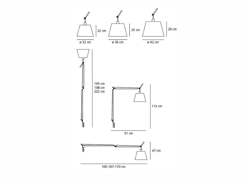 Materiali: struttura a bracci mobili in alluminio lucidato; diffusore in carta pergamena, in raso di seta o in tessuto nero supportato da materiale plastico; snodi e morsetto in alluminio brillantato.Funzionalità: diffusore disponibile in tre dimensioni,orientabile in tutte le direzioni. Sistema di equilibratura a molle.