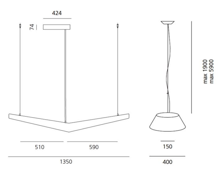 Mouette Simmetrica - LED 55W 1900mm DALI - Apparecchio a sospensione ad emissione diffusa, per lampade fluorescenti lineari 4x24W e LED 55W. Diffusore opalino monoblocco in polipropilene stampato. Alimentazione elettronica, ed elettronica dimmerabile DALI. La struttura superiore dell’apparecchio presenta un’apertura per l’installazione delle sorgenti luminose e per la loro sostituzione. Apparecchio fornito di cavi di sospensione in acciaio a regolazione rapida di 1900mm di lunghezza, rosone e cavo di alimentazione. Sorgenti luminose (3000k) incluse. Conforme alla norma EN60598-1 ed altre norme specifiche. LED 55W 6107lm 3000K CRI 80.
