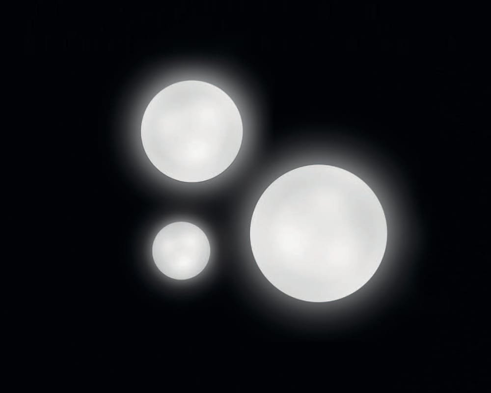 ITKA 50 parete / soffitto. Struttura : metallo verniciato bianco o plastica, diffusore in vetro opalino acidato satinato lavorato a mano. FBT 66W - 3x22W E27.