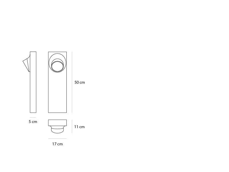 Serie di apparecchi da esterno, disponibili da parete, parete incasso e terra. La versione da terra è disponibile in due altezze h50cm e h90cm, e anche nella emissione bilaterale.Lampade che utilizzano sorgenti LED per una luce intensa e calda a bassi consumi. Fissaggio con flangia.Materiali: cornice in tecnopolimero composito; diffusore in policarbonato diffondente; piastra in acciaio decapato, lavorato e zincato; maschera estetica in alluminio pressofuso EN AB-47100; flangia per fissaggio a terra in acciaio piegato.
