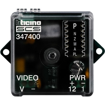 Interfaccia di conversione segnale video da coassiale a BUS 2 fili. Consente di collegare al BUS dell\'impianto videocitofonico una telecamera (PAL) con uscita video coassiale (alimentazione 12 Vd.c. - assorbimento max 150 mA - uscita video 1 Vpp su 75 ohm). Il dispositivo deve essere configurato tramite inserimento fisico dei configuratori.
