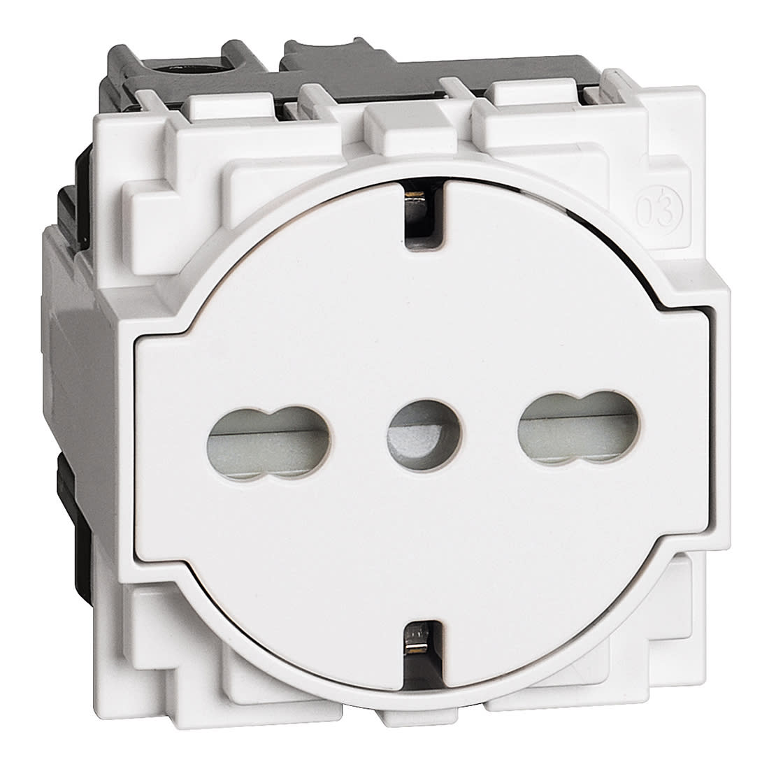 Presa standard Italia P40 flat. La superficie della presa, quando la spina viene inserita, scivola all’interno del pozzetto; ritorna in posizione iniziale quando la spina viene estratta. Presa 2 P+T 16 A 250 Va.c. - interasse 19 mm e 26 mm in configurazione bipasso - alveoli protetti - contatti laterali di terra per spine standard tedesco - adatta per: spine standard Italia 2 P e 2 P+T 10/16 A, spine standard tedesco 2 P+T16 A - 2 moduli, Bianco