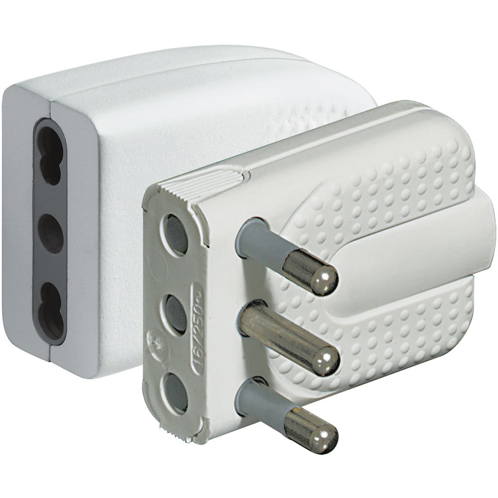 Coppia spina/presa Corner. Spina 2P+T 16A salvaspazio con spinotti orientabili e serracavo autobloccante. Presa 2P+T bipasso 10/16A di colore bianco. Venduta in blister 90x122 mm (LxA).