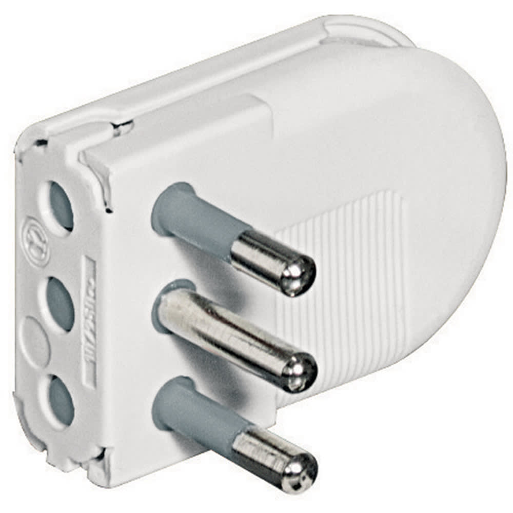 Spina volante 2P+T 10A salvaspazio di colore bianco con uscita cavo regolabile su 3 posizioni e spinotti orientabili . Venduta in blister 90x122 mm (LxA)