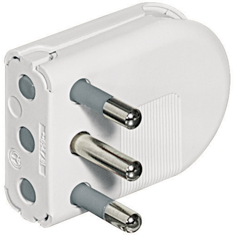 Spina volante 2P+T 16A salvaspazio di colore bianco con uscita cavo regolabile su 3 posizioni e spinotti orientabili. Venduta in blister 90x122 mm (LxA)