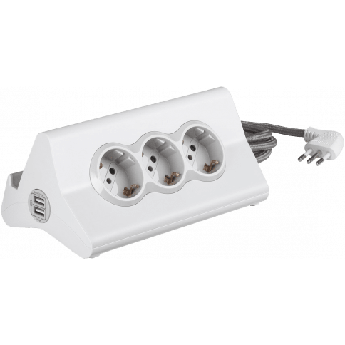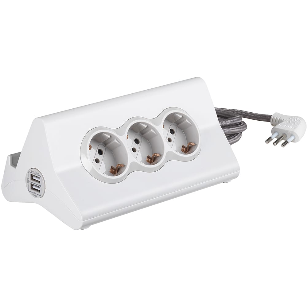 Multipresa hi-tech con 1 USB Quick Charge 5 V 2.4 A max, 1 USB 5 V 1.5 A max. Tre prese standard 10A/16A tipo P30 250 V con alveoli protetti. Cavo telato doppio isolamento tipo H05VV-F lunghezza 2 metri ad alta flessibilità 3x 0,75mm2. Potenza massima prelevabile 2500 W - bianca
