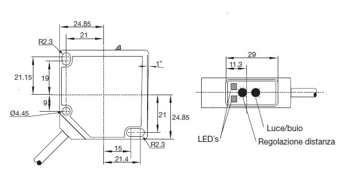 Fotocellula a riflessione diretta con distanza di attivazione fino a 1 m. Sensibilità regolabile. Indicazione di uscita, alimentazione e stabilità del segnale tramite LED. Custodia in ABS 17 x 50 x 50 mm. Semplice installazione. Uscita a relè. Impulso luce/buio selezionabile mediante commutatore.
