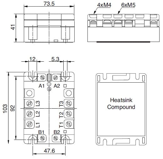 Relè trifase zero switching, varistori integrati, indicazione LED. Dimensioni 74 x 103 x 4(mm). -20°C a +70°C.