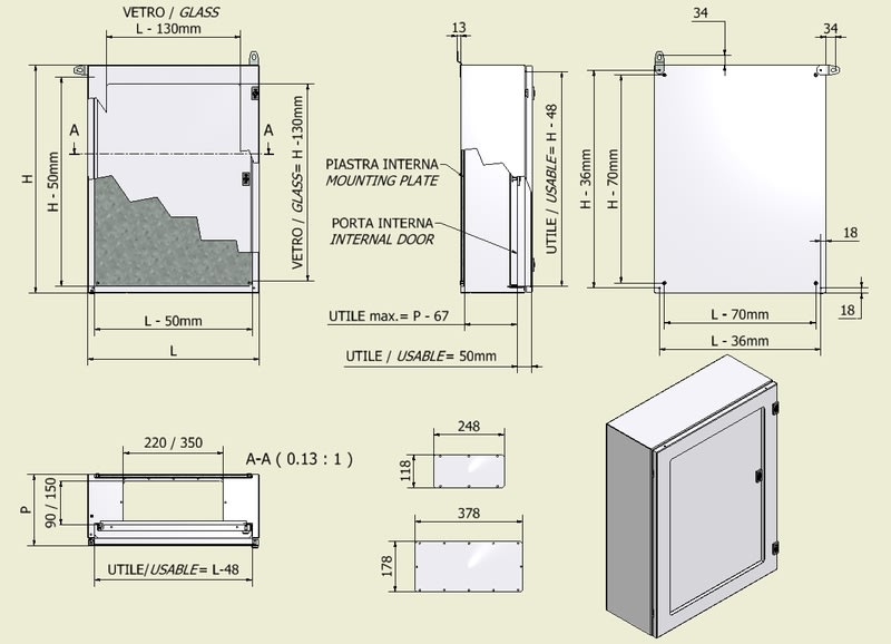 Cassetta composta da corpo, porta esterna trasparente, porta interna cieca, piastra interna fissata sul retro e piastrina passacavi • Corpo in lamiera pressopiegata e saldata sp. 12-15/10 • Porta trasparente in lamiera sp. 15-20/10 • Piastra interna in lamiera sp. 15-20/10 sendzimir • Guarnizioni, poliuretaniche applicate in colata continua • Cerniere reversibili con apertura 110° • Serratura con impronta doppia aletta • Verniciatura con polveri epossipoliestere termoindurenti in tinta RAL7035 bucciato •Grado di protezione IP 55 - TYPE 12