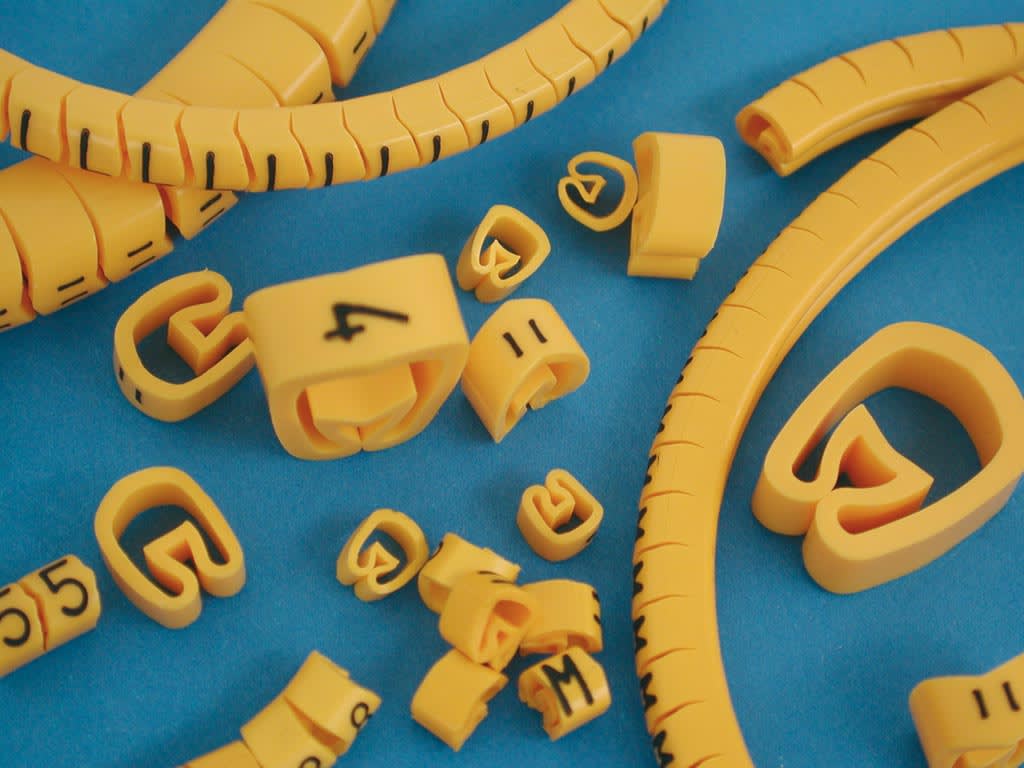 Anelli di siglatura RMS. Si presentano con taglio chevron per un perfetto allineamento sul cavo. La stampa dei contrassegni é realizzata a caldo, con leggera impressione nel materiale per mantenerne l’indelebilità nel tempo. Materiale: PVC morbido, autoestinguente cl. V0 (UL 94)