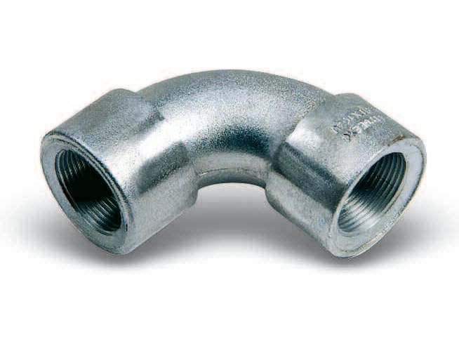 Le curve a 90° non ispezionabili vengono utilizzate negli impianti elettrici in tubo. Lega di alluminio a basso contenuto di rame. Filettatura ISO7/1. Serie ELF (femmina/femmina)