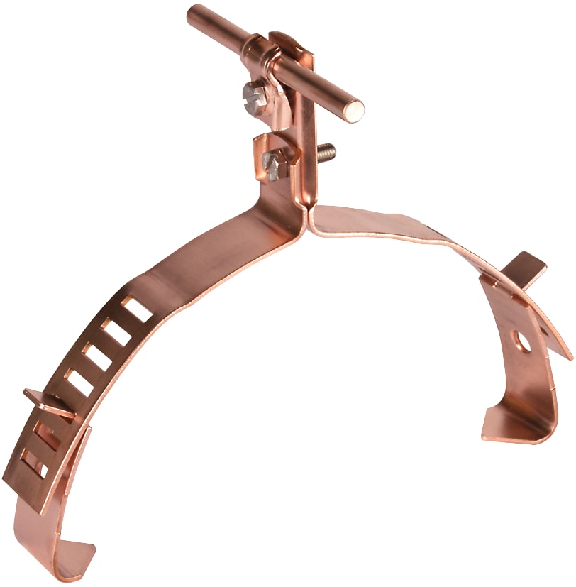 Staffa portafilo per tetti regolabile a gradini con staffa portafilo DEHNquick per il fissaggio di captatori su colmo ad es. per tetti in tegole. Con posa fissa del conduttore in alto al centro.