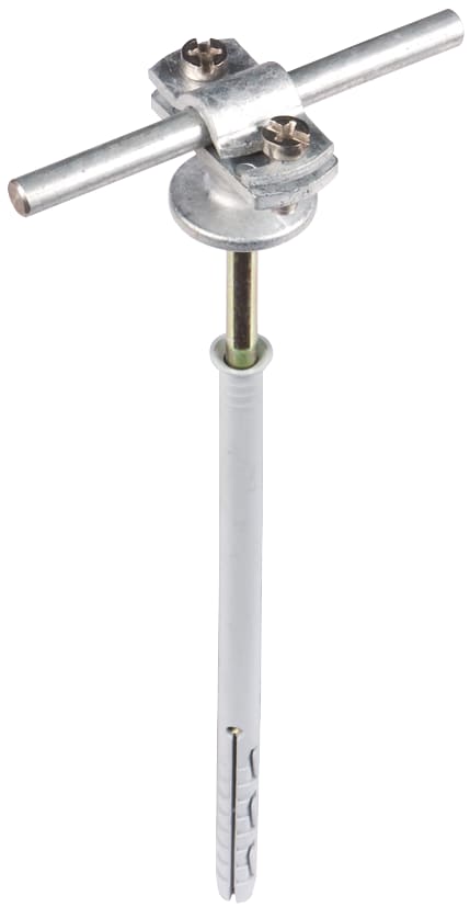 Staffa portafilo per il fissaggio di calate alle pareti con sistema di isolamento termico. Esecuzione con cavallotto a due viti e posa fissa del conduttore.
