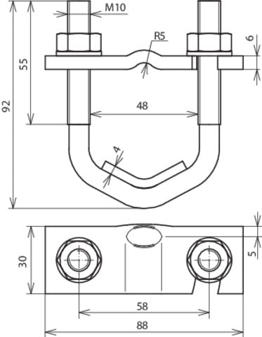 Morsetto a cavallotto secondo CEI EN 62561-1 per il collegamento di ferri d'armatura con conduttori tondi o piatti. Esecuzione per grandi diametri D16-48 mm.