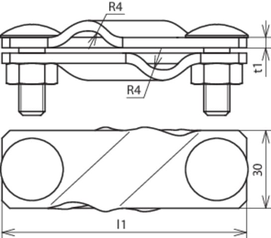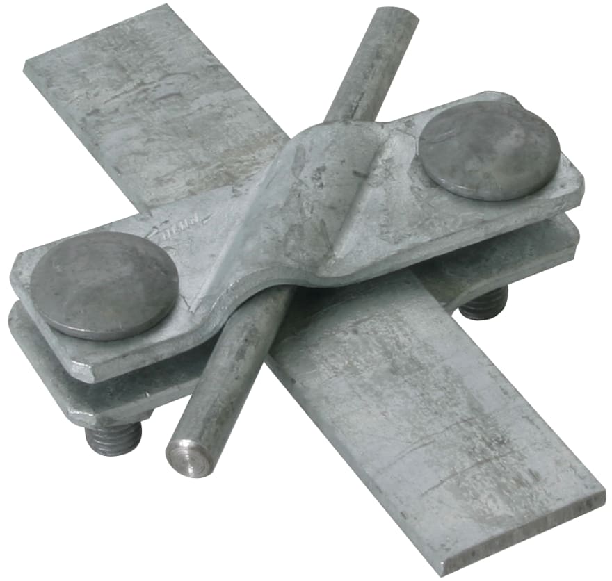 Morsetto di collegamento obliquo secondo CEI EN 62561-1, per collegamenti a croce e a "T"di conduttori tondi e piatti. Esecuzione con antisvitamento delle viti M10.