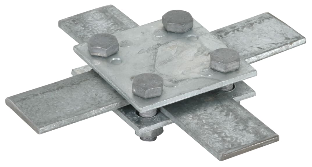 Morsetto a croce secondo CEI EN 62561-1 per collegamenti fuori e sotto terra di due conduttori piatti. Esecuzione senza piastra intermedia con viti M8.