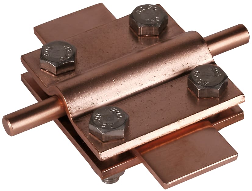 Morsetto a croce secondo CEI EN 62561-1 per collegamenti fuori e sotto terra di conduttori tondi e piatti. Esecuzione senza piastra intermedia con viti M8.