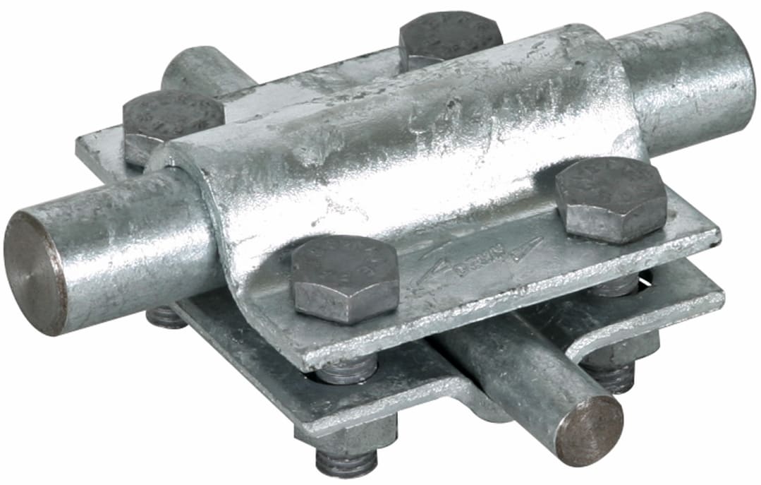 Morsetto a croce secondo CEI EN 62561-1 per collegamenti fuori e sotto terra di conduttori tondi e piatti con aste di adduzione a terra e di captazione. Esecuzione senza piastra intermedia con viti M8.