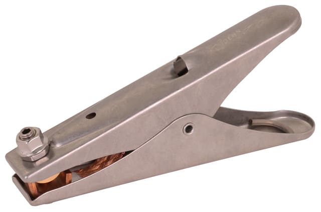 Pinza di messa a terra per un sicuro collegamento a terra e scarica a terra di cariche elettrostatiche di autobotti, velivoli, container e contenitori. Idoneo per l'applicazione in ambienti a rischio di esplosione. Esecuzione grande, superficie di contatto in ottone senza punte in acciaio e cavallotto di contatto in rame. Collegamento: perno filettato M10 con dado.