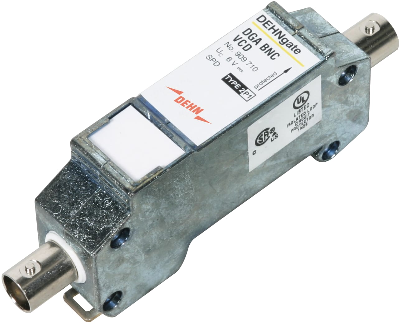 Limitatore di sovratensione in costruzione stretta con connettori femmina BNC. Adatto per il montaggio su guida profilata per la protezione di sistemi video e telecamere di TV a circuito chiuso. Con messa a terra diretta.