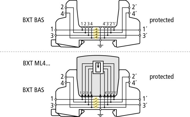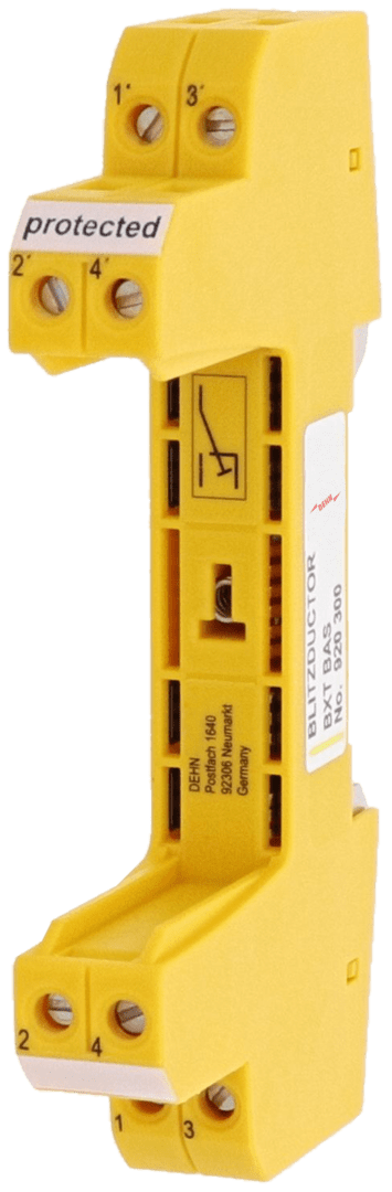 Elemento base del BLITZDUCTOR XT come morsetto passante universale tetrapolare in costruzionestretta, per l’innesto del modulo di protezione senza sezionamento del segnale. La sicura messa a terra del modulo di protezione avviene tramite il piedino di fissaggio montato a scatto sulla guida profilata. L’elemento base non contiene componenti di protezione, così il lavoro di manutenzione si limita ai moduli di protezione.