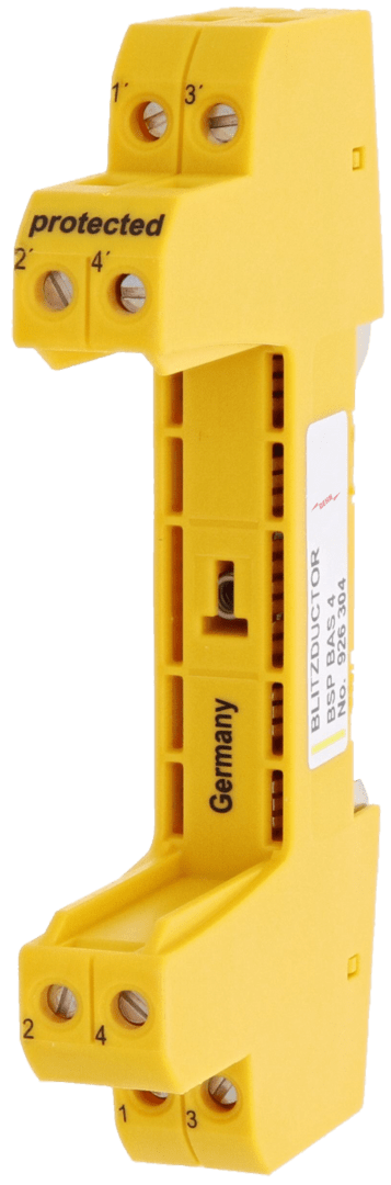 BLITZDUCTOR SP-elemento base come morsetto di collegamento in versione molto stretta, tetrapolare, universale per il collegamento di un modulo scaricatore con interruzione del segnale in caso di modulo di protezione non innestato. La messa a terra sicuradel modulo scaricatore viene stabilita per mezzo del piedino della guida profilata tramite un montaggio a scatto. Poiché non ci sono elementi di costruzione del circuito di protezione nell'elemento base, i lavori di manutenzione si limitano ai moduli di protezione.