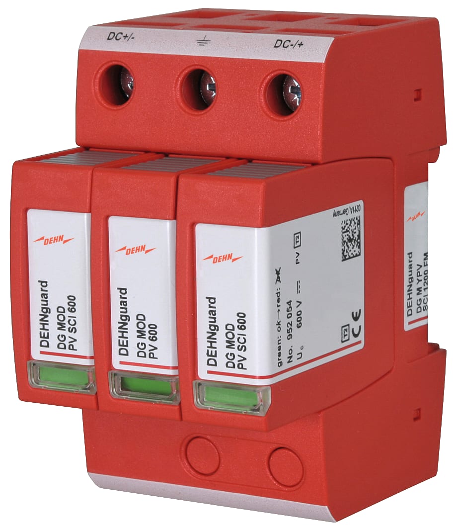 Limitatore di sovratensione multipolare DEHNguard M YPV SCI, Tipo 2 secondo EN 50539-11 con dispositivo di manovra in corrente continua a tre gradini, composto da base e moduli di protezione innestati. Dispositivo di sezionamento e di messa in corto circuito integrato nel modulo che garantisce un sicuro sezionamento elettrico. Per la protezione da sovratensione di impianti elettrici utilizzatori in bassa tensione. Per l'utilizzo secondo IEC 60364-7-712:2002-05 (Costruzione di impianti elettrici utilizzatori fotovoltaici).