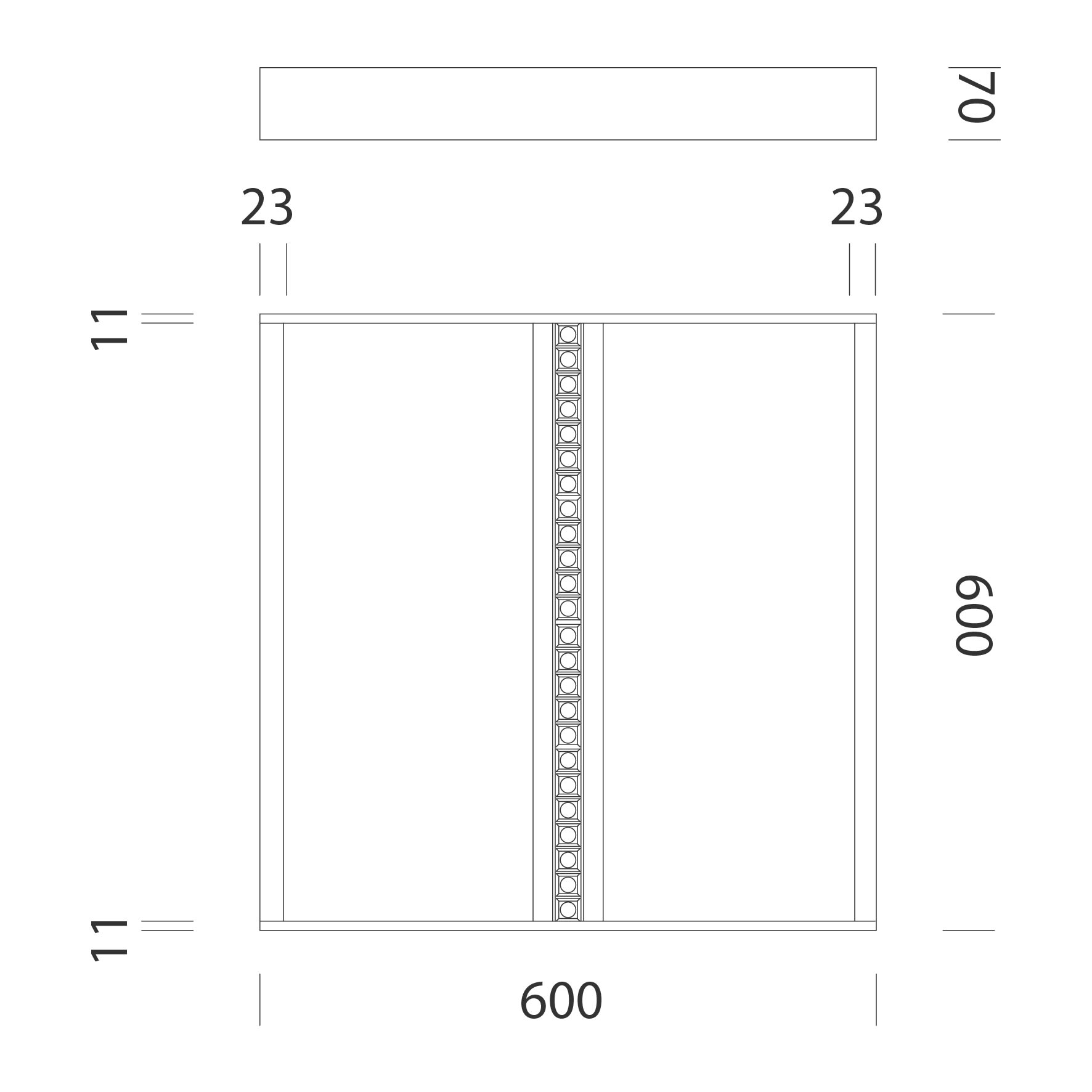 Corpo: in lamiera di acciaio stampato. Ottica dark light: a singoli alveoli con lente in PMMA, per una massima riduzione dell’’abbagliamento. Lastra Interna: in PMMA. Diffusore: in tecnopolimero prismatizzato ad alta trasmittanza. Fattore di abbagliamento UGR: UGR<16 (in ogni situazione). Secondo le norme EN 12464. LED: Fattore di potenza: 0,9 Mantenimento del flusso luminoso al 90%: 50.000h (L90B10). Classificazione rischio fotobiologico: Gruppo esente. 33W. 3265 lm. 4000 K