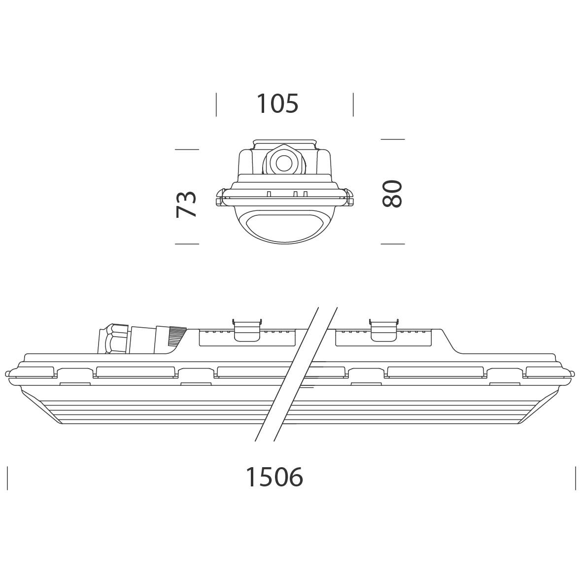 Corpo: stampato ad iniezione in policarbonato grigio, infrangibile ed autoestinguente, stabilizzato ai raggi UV, di elevata resistenza meccanica grazie alla struttura rinforzata da nervature interne. Diffusore: stampato ad iniezione in policarbonato trasparente con rigatura e satinatura interna per un maggior diffusione luminosa, autoestinguente V2, stabilizzato ai raggi UV, finitura esterna liscia per facilitare la pulizia necessaria per avere la massima efficienza luminosa. Chiusura a incastro e con viti di sicurezza in acciaio inox. Riflettore: in acciaio zincato preverniciato bianco a forno con resina poliestere stabilizzato ai raggi UV. 23W. 4302 lm. 4000 K. Emergenza