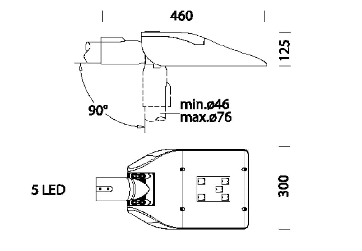 Corpo e telaio: In alluminio pressofuso e disegnati con una sezione e bassissima superficie di esposizione al vento. Alette di raffreddamento integrate nella copertura. Ottiche: Sistema a ottiche combinate realizzate in PMMA ad alto rendimenti resistentealle alte temperature e ai raggi UV. Recuperatori di flusso in policarbonato V2. Attacco palo: In alluminio pressofuso è provvisto di ganasce per il bloccaggio dell’armatura secondo diverse inclinazioni. Orientabile da 0° a 20° per applicazione a frusta; e da 0° a 15° per applicazione a testa palo. Passo di inclinazione 5° Idoneo per pali di diametro 46-76mm. Diffusore: vetro trasparente sp. 4mm temperato resistente agli shock termici e agli urti (UNI-EN 12150-1 : 2001). Verniciatura: A polvere con resinaa base poliestre, resistente alla corrosione e alle nebbie saline. Dotazione: Dispositivo automatico di controllo della temperatura all’interno dell’apparecchio con rispristino automatico. Protezione contro gli impulsi conforme alla EN 61547. Con dispositivo elettronico dedicato alla protezione del modulo LED. Equipaggiamento: Completo di connettore stagno IP67 per il collegamento alla linea. Dissipatore: Il sistema di dissipazione del calore è appositamente studiato e realizzato per permettere il funzionamento dei LED con temperature inferiori ai 50° (Tj = 25°) garantendo ottime prestazioni/ rendimento ed un’ elevata durata di vita. NORMATIVA: Prodotti in conformità alle norme EN60598 - CEI 34 - 21. Hanno grado di protezione secondo le norme EN60529. Tecnologia LED di ultima generazione Ta -30 + 40°C vita utile 50.000h al 80% L80B20. Classificazione rischio fotobiologico: Gruppo di rischio esente. Lampada: LED white 30W 4050Lm 4000K CRI80.