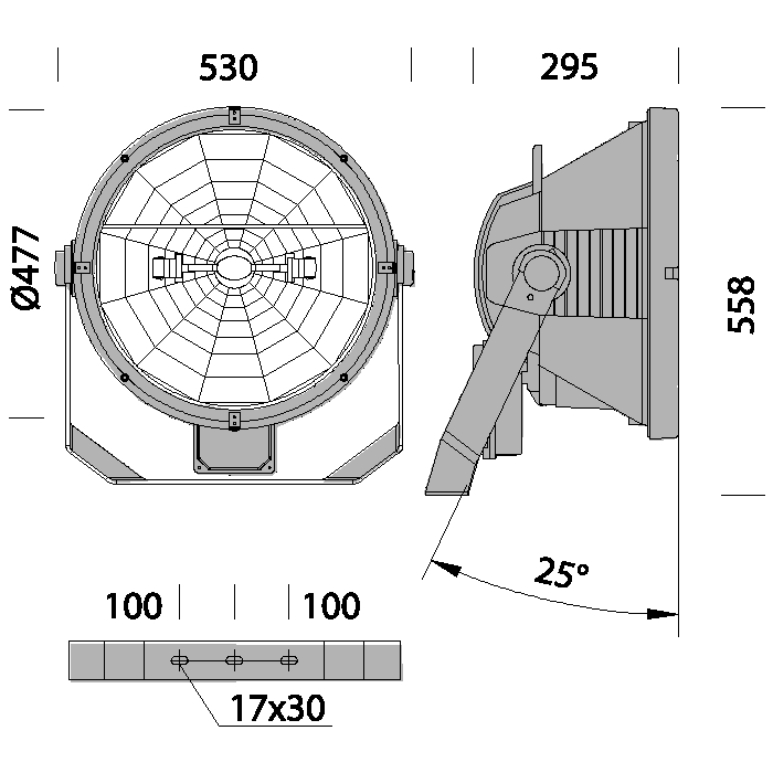CORPO/TELAIO: In alluminio pressofuso, con alettature di raffreddamento. RIFLETTORE: In alluminio 99.98, ossidato anodicamente e brillantato con aletta di recupero del flusso luminoso. DIFFUSORE: Vetro temperato sp. 5 mm resistente agli shock termici e agli urti (prove UNI EN 1250-1:2001). VERNICIATURA: a polvere poliestere colore grigio grafite resistente alla corrosione e alle nebbie saline. PORTALAMPADA: In ceramica e contatti argentati. Attacco a cavo. CABLAGGIO: Alimentazione 230V/50Hz. Cavetto flessibile capicordato con puntali in ottone stagnato, isolamento in silicone con calza in fibra di vetro, sezione 2.5 mm². Morsettiera 2P+T in nylon con massima sezione dei conduttori ammessa 6 mm². EQUIPAGGIAMENTO: Pressacavo in nylon f.v. diam. 1/2 pollicegas. Dispositivo di protezione: al momento dell'apertura (a cerniera) della parte posteriore il contatto da normalmente chiuso si apre interrompendo l'alimentazione. Con mirino per il puntamento. Valvola di ricircolo aria. Completo di accenditore posto nell'apposita cassetta in dotazione. NORMATIVA: Prodotti in conformità alle vigenti norme EN60598-1 CEI 34-21, sono protetti con il grado IP66IK08 secondo le EN 60529. Hanno ottenuto la certificazione di conformità Europea ENEC. ALTRI CABLAGGI: Con cablaggio per la riaccensione a caldo POTENZA LAMPADE: MAX-TS1000; MAX-TS2000. Superficie di esposizione al vento: 1800 cmq. Riaccensione a caldo con sottocodice -99.