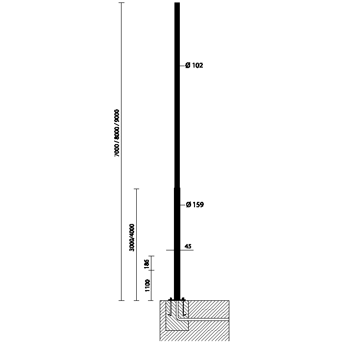 1417 Palo in acciaio con base ø102-159 - Palo in acciaio zincato a caldo spessore 4mm. Con finestra d'ispezione in alluminio pressofuso (186x45mm), completo di 2 portafusibile di protezione, 2 fusibili da 16A, morsettiera asportabile a 4 poli. Predisposto con foro per ingresso cavo di alimentazione. Per la versione con base è necessario acquistare 4 tirafondi da interrare, bulloneria e tappi. Peso: 34Kg. Colore: Grafite.