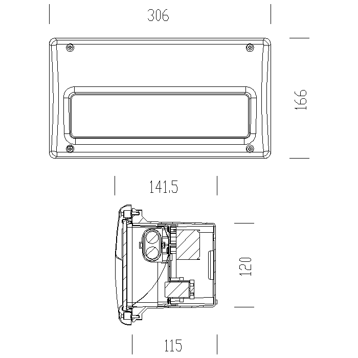 CORPO: Rettangolare in nylon f.v., colore grigio RAL 7035 infrangibile stabilizzato ai raggi UV, (parte da incassare nel muro). CORNICE: In acciaio inox AISI 316, ideale anche in zone marine. DIFFUSORE: In vetro temperato resistente agli shock termici e agli urti (prove UNI 7142 British standard 3193). RIFLETTORE: Asimmetrico in alluminio rigato. PORTALAMPADA: In policarbonato e contatti in bronzo fosforoso. CABLAGGIO: Alimentazione 230V/50Hz. Cavetto rigido sezione 0.50 mm2. Morsettiera 2P con massima sezione dei conduttori ammessa 2.5 mm2. EQUIPAGGIAMENTO: Guarnizione di tenuta in gomma. Con piastra di cablaggio in policarbonato.