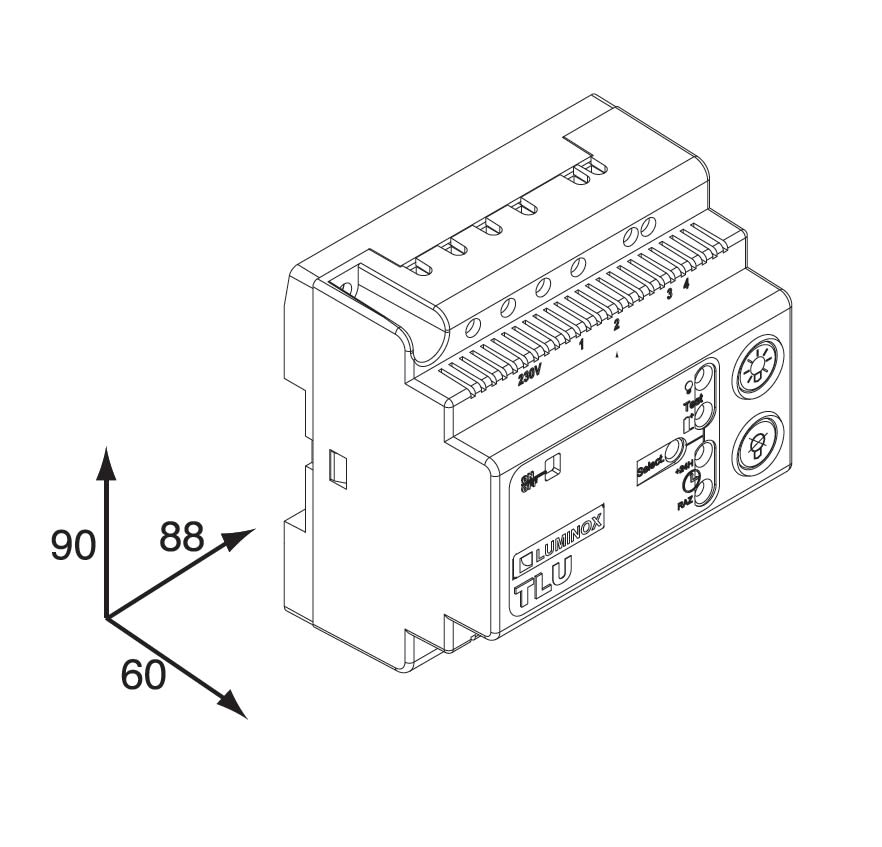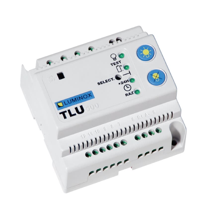 Modelli disponibili: Telecomando TLU. Costruzione: ABS. Installazione: Su barra DIN, richiede 5 moduli. Interfaccia utente: Pulsante di accensione e spegnimento, selettore di modalità. Segnalazioni: 4 LED verdi per segnalazione dello stato di test di funzionamento, autonomia, test ritardato di 24h. Compatibilità: TLU è compatibile con tutti gli apparecchi Eaton dotati di funzione rest-mode. Capacità del sistema: n.500 apparecchi max. Topologia: Collegamento in parallelo con resistenza di bilanciatura di fine linea (fornita in dotazione). Ingressi/Uscite: Ingresso per il collegamento remoto del pulsante di attivazione e disattivazione, uscita relè per il riporto dello stato del telecomando. Batteria: n.1 x 8,4V 150mAh fornita in dotazione (attenzione, il telecomando non funziona senza batteria). Autonomia: Fino a 72ore in assenza di rete elettrica. Funzioni di test: Test manuale di funzionamento e autonomia degli apparecchi collegati. Alimentazione; 230V 50/60Hz, 10mA. Temperatura di funzionamento: Da +5 a +25°C. Grado di protezione: IP20.
