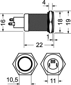 PULSANTE LUMINOSO ANTIVANDALISMO CON AUTORITORNO. Duplice funzione di pulsante normalmente aperto e normalmente chiuso. CORPO:ottone nichelato. CONTATTI:argento. TERMINALI:a saldare. TENS. LED :12 Vcc. RESIST.ISOL.:1000 MOHM. RES. CONT.:50 mOHM. GRADO DIPROTEZ.:IP 40. TEMP.LAV.:-20°C ÷ +55°C. FORAT.PANN.:Ø 16 mm. PORTATA MAX.:3 A-250 VCA. Col. Led: Verde.