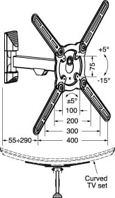 SUPPORTO DA MURO PER TV LED/LCD/PLASMA 2 SNODI. Con due snodi ruotabili in orizzontale di +/-90° e inclinabile in verticale di +/-15°. Adatto anche per monitor curvi. Di facile montaggio per TV standard VESA 75-100-200-400. TV LCD:32”÷55”. DISTANZA MURO:5,5 ÷ 29 Cm. PESO MAX .:30kg. PESO SUPPORTO:2,3kg.