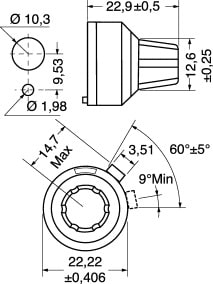 MANOPOLA ANALOGICA Ø 22MM. Risoluzione cinquantesimale. N°ROTAZ.MAX:20 giri. TEMP.LAVORO:-55°÷+71°C. CORPO:cromo satinato. IMPUGNAT.:plastica nera. PER POTENZIOM.:2/31000 – 2/31100. MODELLO:2606.