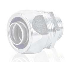 Raccordo con filetto maschio, utilizzabile ovunque ci sia un foro filettato, avvitandolo direttamente, o un foro passante, con l'ausilio di un controdado dalla parte opposta. Il raccordo è realizzato in ottone nichelato. Il grado di protezione tra il raccordo e la guaina è IP67, certificato secondo le norme CEI EN 61386, garantito dall'anello di tenuta che si stringe sul tubo quando si serra il dado. In questo modo il sistema garantisce una perfetta tenuta meccanica, alla trazione certificata >1000 N, alla torsione e alle vibrazioni. La continuità elettrica è garantita dalla virola interna che si avvita direttamente all'interno dell'anima metallica della guaina, ricoprendo interamente l'estramità del tubo flessibile a protezione del passaggio cavi.