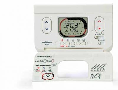 Cronotermostato elettronico a microprocessore, con programmazione giornaliera per il comando di impianti di riscaldamento e di condizionamento.Alimentazione con 2 batterie stilo AA da 1,5V lunga durata.Modulo trasmettitore RF con potenza minore o uguale a 25mW, ad 868,350 MH z.Intellitherm C58RF viene fornito con uno zoccolo adatto per il montaggio su scatole da incasso a 3 moduli, tonde o per montaggio a parete, la sporgenza dell'apparecchio è minima e l'ambientazione ancora più facilitata.Montare il cronotermostato a 1,5 metri di altezza dal pavimento, lontano da cucine, finestre, porte e fonti di calore in generale.Due pulsanti colorati, uno rosso e l'altro blu per la regolazione delle temperature di COMFORT e di ECONOMY.Un cursore per la scelta del modo di funzionamento: A1, A2, COMFORT, ECONOMY, ANTIGELO.Un cursore per la scelta del tipo di funzionamento: ESTATE-INVERNO, con lo stesso cursore si può accedere alla programmazione.Due tasti per la regolazione dell'ora in corso.Tre tasti per la scelta del periodo di COMFORT, di ECONOMY e ANTIGELO.Un tasto di RESET per ripristinare il programma preimpostato.Un dip switch per selezionare il modo ANTIGELO 5°C oppure SPENTO (ON a 0°C).Possibilità di visualizzazione dei dati statistici dell'impianto: ore di funzionamento del giorno precedente e dall'inizio del funzionamento dell'apparecchio, temperatura minima e massima del giorno precedente e l'ora in cui viene misurata.Possibilità di sapere per quante ore è stato "richiesto calore"(relè chiuso - ON) il giorno precedente e dall'inserimento delle pile o da un reset