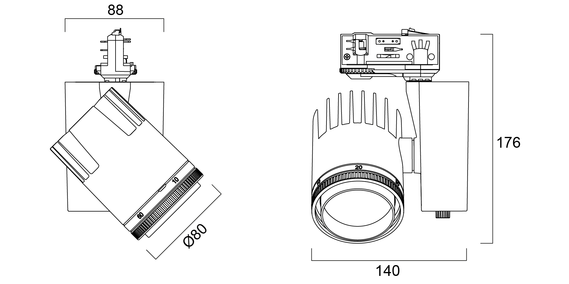Integrated LED spotlight, black RAL 9005, compact and minimalist design, low glare, dark-light detail for increased accentuation and visual comfort, ideal for museum, gallery and high-end retail applications, die-cast aluminium body, passive cooling heatsink, beam angle: 52° wide beam, optics: Aluminium reflector, colour temperature: 4000K neutral white, total system power: 21W, total fixture output: 1578lm, luminaire efficacy: 75lm/W, LOR: 100%, colour rendering: Ra 97 typical, R9 value at 90, LED Chromacity: 3 step MacAdam ellipse, IR/UV free light source without heat radiation, operating voltage: 220-240V / 50-60Hz, drive current: 500mA, electronic driver, dimmable via on-board potentiometer, power factor: 0.9 electrical protection: CLASS II, 3-circuit track adaptor, suitable for Concord Lytespan 3 track, ingress protection rating: IP20, suitable for internal environment only, horizontal rotation: 355°, vertical tilt: 90°, dimensions: Ø80x130x169mm, weight: 0.96kg.