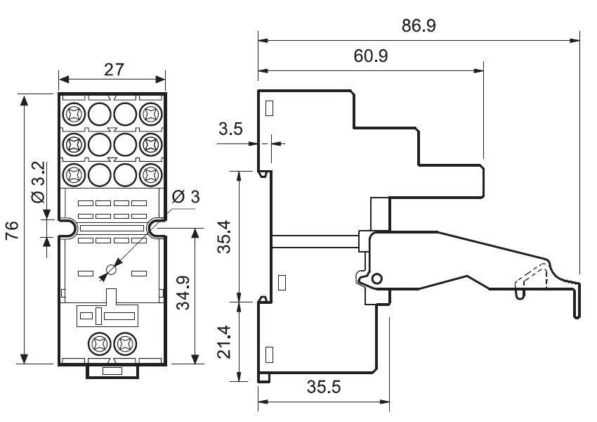 Zoccolo con morsetti a bussola Montaggio: barra cieca 35 mm (A): 10 Colore: Nero Grado di protezione: IP 20 Accessori: Ponticello metallico o plastico;pettine 6 poli;moduli temporizzatori;moduli di segnalazione e protezione EMC