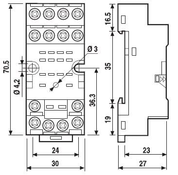 Zoccolo con morsetti a piastrina Montaggio: barra cieca 35 mm (A): 10 Grado di protezione: IP 20 Accessori: Ponticello metallico;moduli di segnalazione e protezione EMC