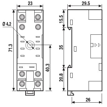 Zoccolo con morsetti a piastrina Montaggio: barra cieca 35 mm (A): 10 Grado di protezione: IP 20 Accessori: Ponticello metallico;moduli di segnalazione e protezione EMC