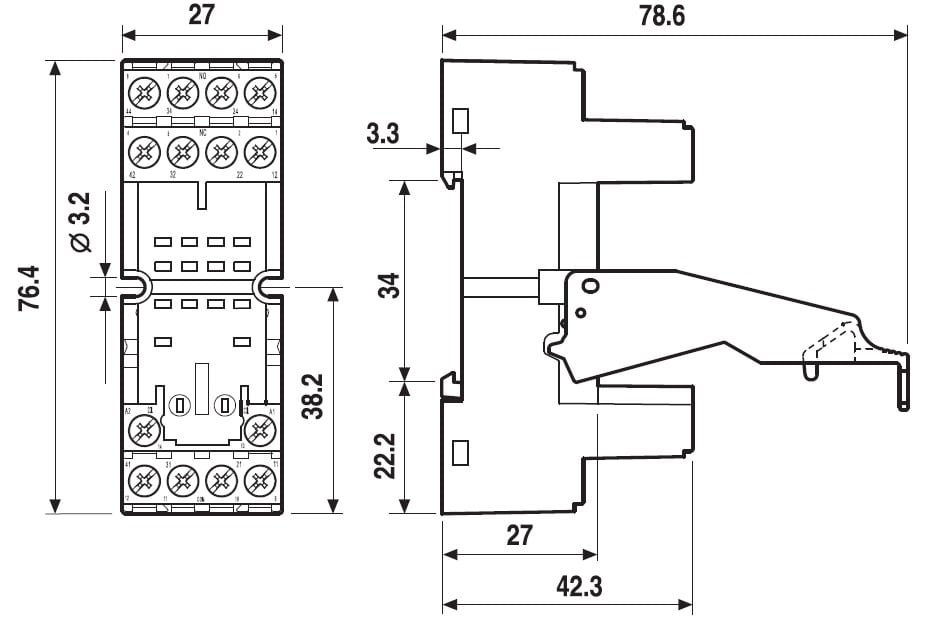 Zoccolo con morsetti a bussola Montaggio: barra cieca 35 mm (A): 10 Grado di protezione: IP 20 Accessori: Ponticello metallico o plastico;moduli di segnalazione e protezione EMC;pettine 6 poli