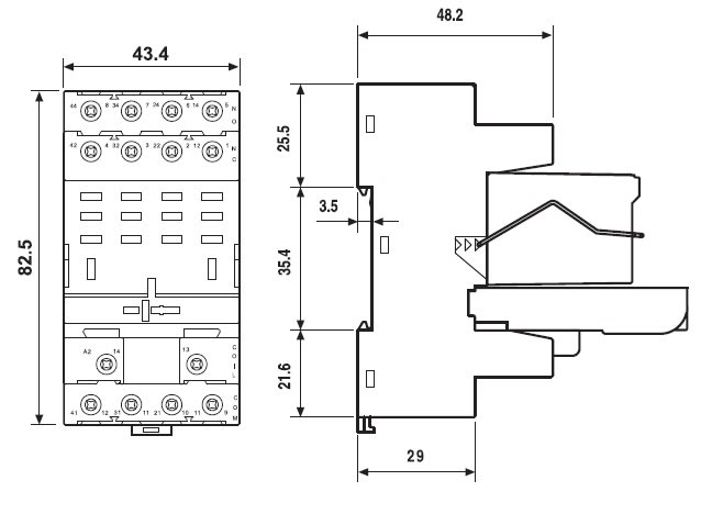 ZOccolo con morsetti a bussola Montaggio: barra cieca 35 mm (A): 12 Grado di protezione: IP 20 Accessori: Ponticello metallico;moduli di segnalazione e protezione EMC;moduli temporizzatori