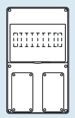 Quadretto stagno verticale vuoto per prese fisse compatte protette e stagne. Dotato di guarnizioni per prese COMBIBLOC. La portella è predisposta per la serratura di sicurezza GW40422. • Numero prese IB alloggiabili: 2 COMBIBLOC 16/32A • Numero moduli EN50022: 8 • Numero di flange in dotazione: 1 • Potenza dissipabile: 13W